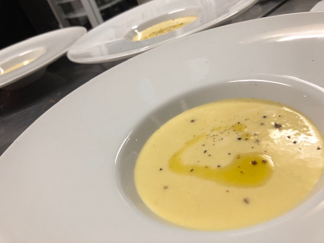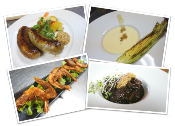 自家製ソーセージ・ヤングコーンのポタージュスープ・まるごと海老のから揚げ・ビーフシチュー